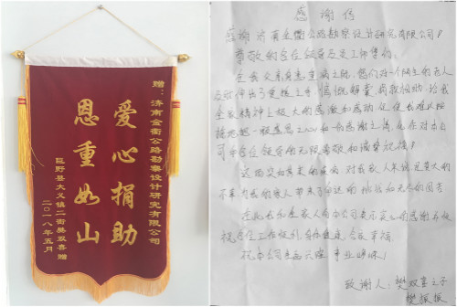 5月24日,菏澤市巨野縣大義鎮二街樊雙喜委托家人專程來到濟南金衢公路勘察設計研究有限公司,將一面寫有“愛心捐助 恩重如山”的錦旗和一封感謝信送到公司工作人員手中,借此表達對濟南金衢公司全體員工對樊雙喜一家及時伸出援助之手、慷慨解囊渡難關的感激之情。